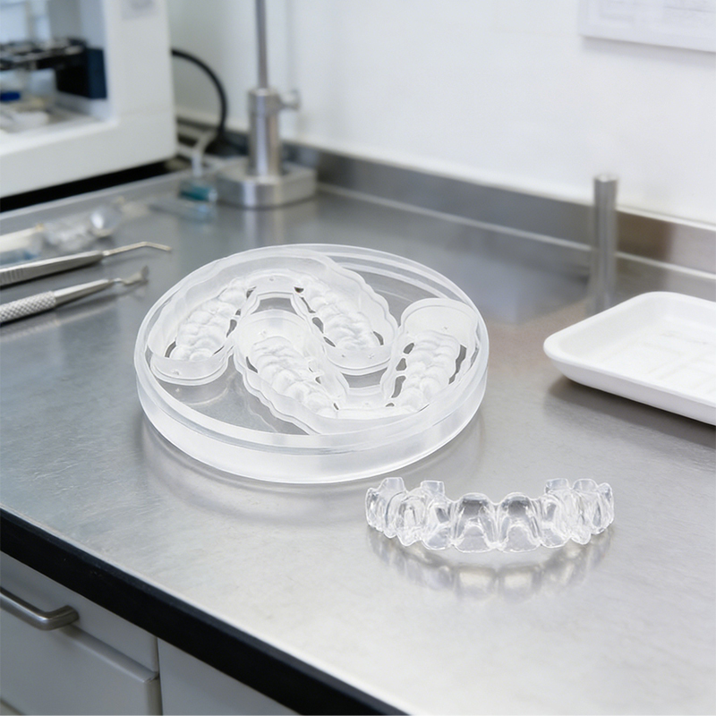 Transparent PMMA allows clear view of tooth contacts and jaw relations, ideal for bite plates and functional appliances.